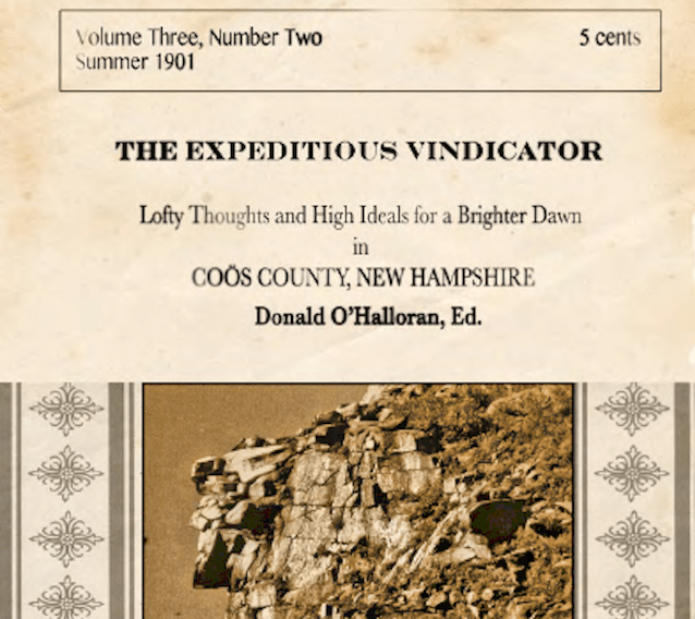 The Evil Twins ostensibly discovered the Expeditious Vindicator on one of our many forays into a passé concocté, in the attic of Benjamin Waterman’s house in Whitefield, New Hampshire, where Wanda found a large cardboard box, its sides sagging outward with yellowed issues of a pictorial magazine published in Littleton, New Hampshire in the first two decades of the twentieth century.